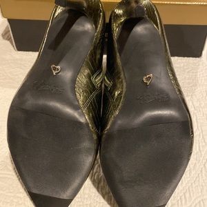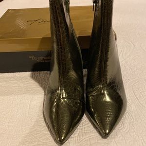 Metallic green faux snake skin boot. Side zipper and 4 inch heel
