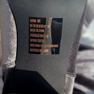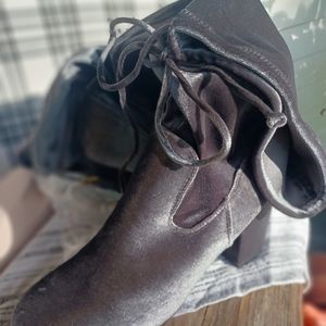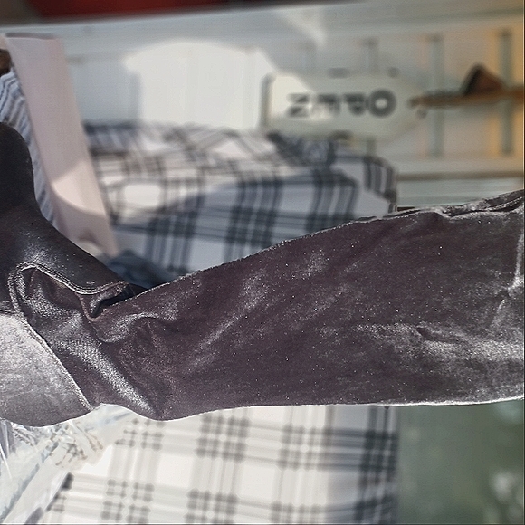 velvet silver heel thigh high boot, ties in back, sparkly, very comfortable.