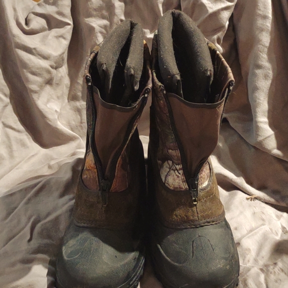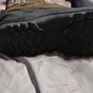 size 5 leather and camouflage canvas boots with removable thermal insert.