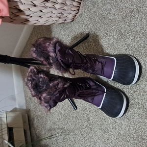 Fur snow boots, string up, comfortable, worn once, warm, clean, purple/maroon, size 10