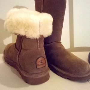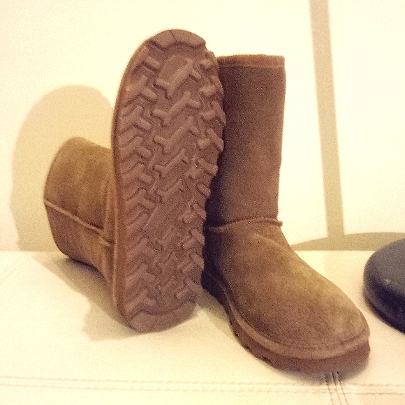 Bearpaw,Elle 1962w/Hickory || ,treated with neverwet, suede upper sheepskin/wool blend lining sheep skin wool bed blown rubber out sole size 7 medium width with original box.a great looking used pair of boots wouldn't you say.