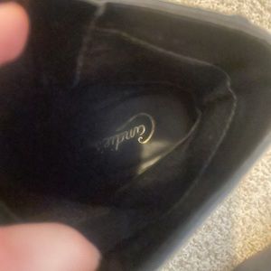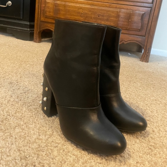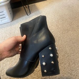 Black pleather boots by Candies. Have a few jewels missing as seen in photos but not very noticeable when they’re worn.