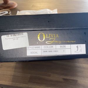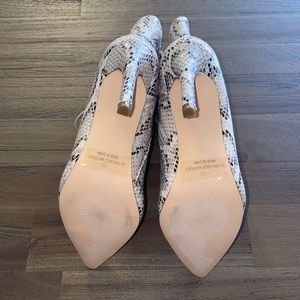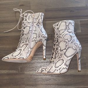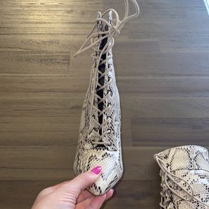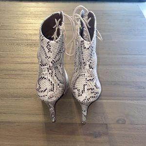 “The Trendsetter Heels” in size 6 purchased from Hope’s. Snake skin print boots featuring adjustable lace up front & pointed toe. Inside zipper closure. Brand new with tags & box IS included.
