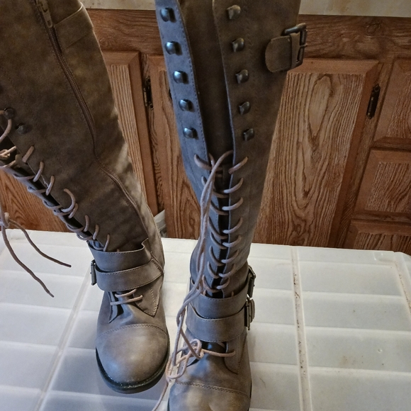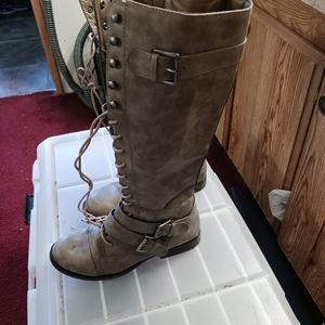 these cute lace up boots have a bit of a wider shaft that is 16" tall. very nicely made only worn twice.