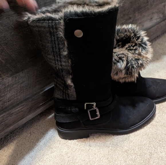 Black boots by JustFab. no room in my closet. I love that they fold over if you want to show the fur, or wear up for the plaid look. they are extremely warm on the legs when worn up.