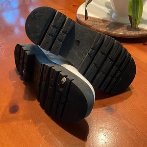Cute white rain boots with chunky soles, a couple little scuffs, easy to polish out