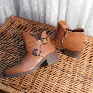 Bootie with zipper side and buckle straps.