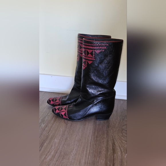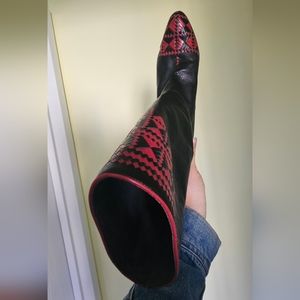 Stephanie Kelian black boots with beautiful red detailing. Boots say 5 but these fit like a size 7. Measured the bottom and they are 9.525 inches.