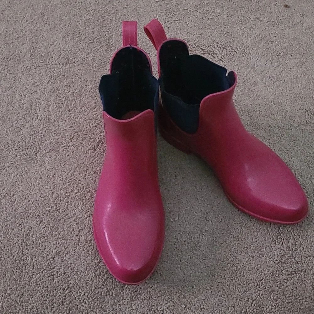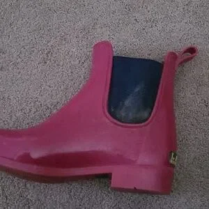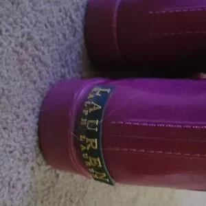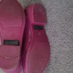 Pink Ralph Lauren rubber boots. No tears or rips. Few spots need scrubbed a bit but in good shape. size 6 and little snug for me. I wore them to go out in the garden since wipe off easy.