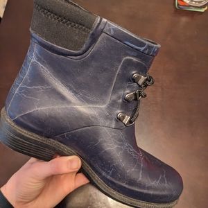 merona size 8 boots. there is some wear from sitting in my closet (pictured) but the soles are in great shape, barely worn outside. waterproof. color is navy/dark blue but in some lights can look closer to black.