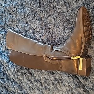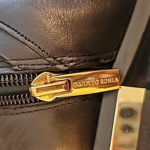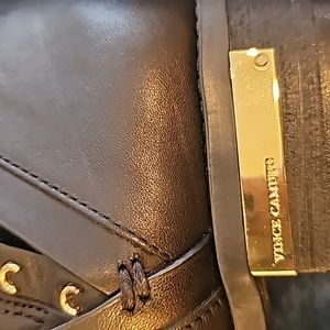 Brand new without tags! Never worn Stylish Vince Camuto boots in black leather and gold tone hardware! Hook gold tone design on the outside of the boot legs!