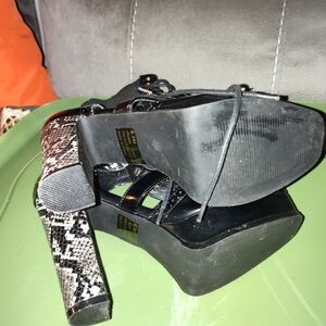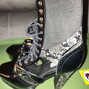 Pair of black patent leather boots with black and white leopard heels.