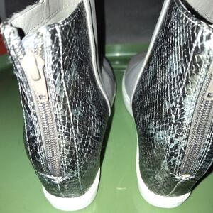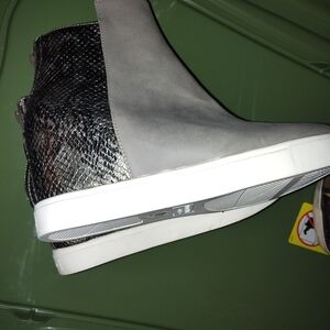 Pair of grey ankle boots with leopard