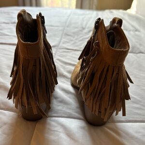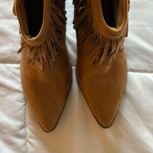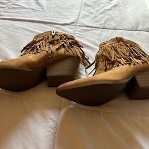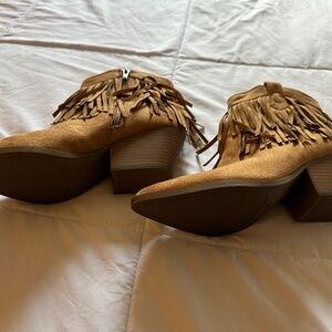 Faux Suede ankle Boots with fringe. Brand New! Never Worn! Mint Condition! Theses adorable Booties have a side zipper and 2” heel.