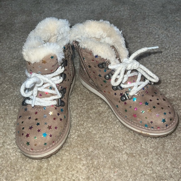 Brown lace boots w faux fur lining and iridescent Star pattern