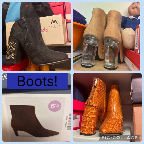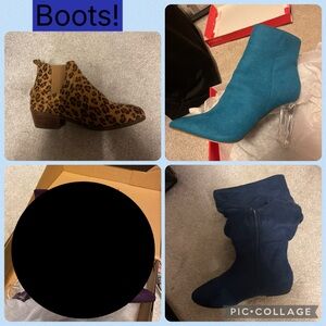 Explore my stylish collection of women's boots (mostly ankle length) featuring leopard print, teal, black, and navy suede designs. Perfect for adding a chic touch to any outfit. This listing is for ONE pair. Indicate which you prefer in the comments or via messages after purchase. Most are size 7, except the Target pair that shows the size on the box (6.5). And most are new/unused. Even the worn ones are EUC, like new. Ask questions as needed. Smoke free, pet friendly home. Thx!