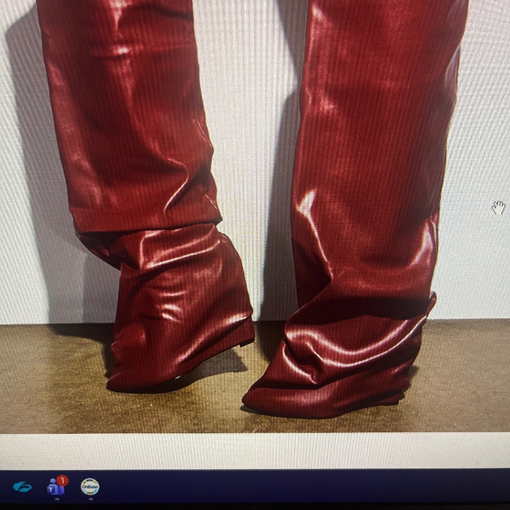Burgundy high high boots, short gold bootues, short black booties with the toes out