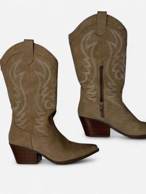 Beige Western Cowgirl Boots Embroidered Mid-Calf Boots Size 7.5