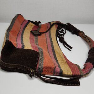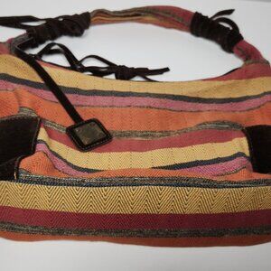 This bag has a spacious interior with a zippered closure, padded, wrapped fabric handle with suede ties and multicolored chevron and horizontal stripe pattern with textured detailing.