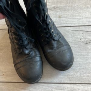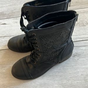 Black boots, lace up and zipper in the back. Toole design on the side. In good condition. Small marls on the right toe.