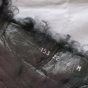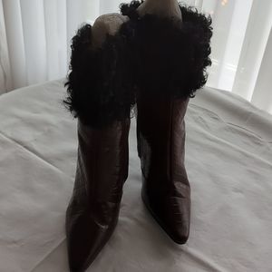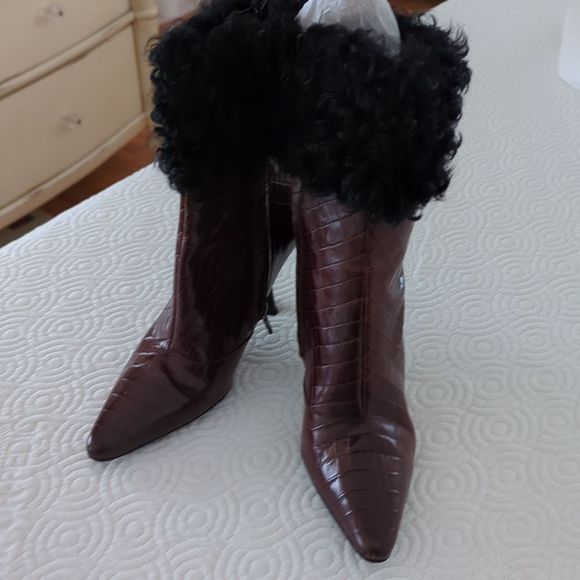 size 6 ladies faux alligator, dk brn with black curly lamb cuffs. almost new. size zip.
