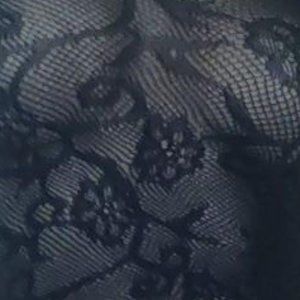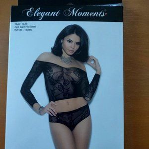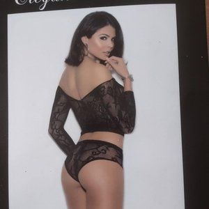 Black lace off the shoulder top and matching booty shorts.