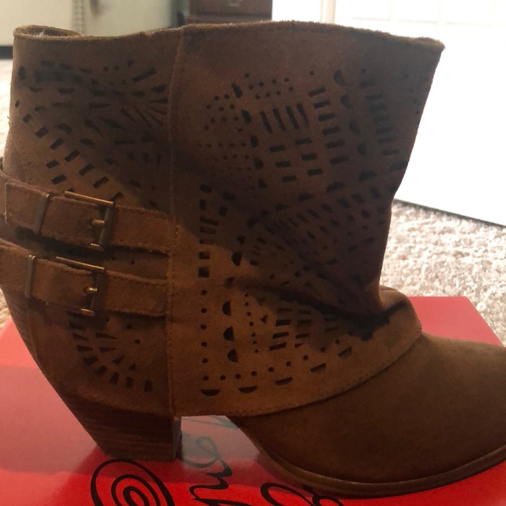 Tan boot booties. Shoes have only been worn twice. The box is still intact as well as the shoe bag for each boot.