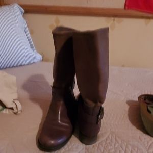 Mid size brown leather boot with small side buckle. Pull on.