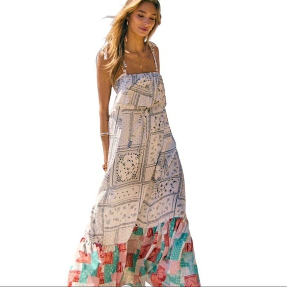 Boder Print Detailed Ruffled Detail and Ribbon straps that tie at the shoulder. Very lightweight and soft material