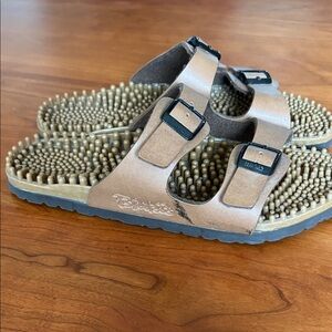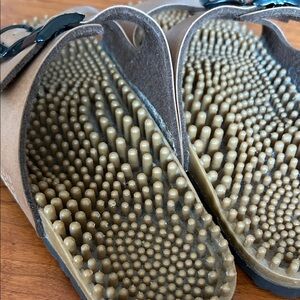 Acupressure Footbed: These sandals are characterized by their unique "noppy" footbed, featuring hundreds of rubber nubs designed to provide a reflexology massage while walking.
