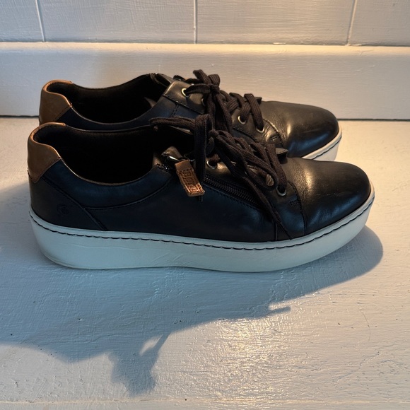 Born leather sneakers with lace-up design. Features black upper and tan accents. Comfortable for daily wear.