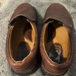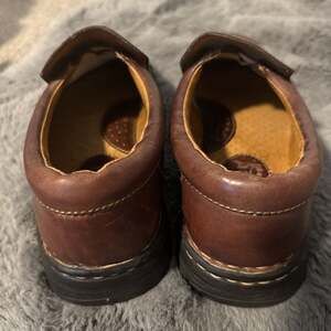 Vintage Born Brown Leather Slip-On Loafers, Women's Size 8— Comfort and Classic Style. These durable shoes feature high-quality leather uppers with contrast stitching and a sturdy rubber sole for all-day support. The cushioned footbed and breathable lining ensure a comfortable fit. Good pre-owned condition with some visible scuffing and wear on the insoles as shown in photos. Perfect for casual wear or work. Style number B9223.