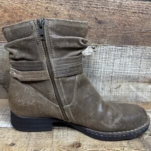 Born Amarena Boots. Style# D70317. Size 9.5. Color ~ Brown. Western-inspired style with a twist! Distressed leather. Tied leather tassels at the ankle. Burnished toe. Moisture wicking plaid fabric lining. Side zip. Excellent condition.