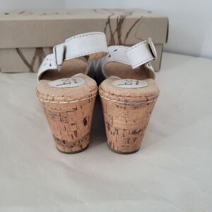 Excellent condition, nearly new. White leather with floral laser cut details. Slingback strap with adjustable buckle, cork wedge heel. Peep toe. US size 9 EU size 40.5