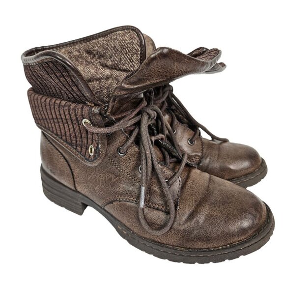 Born BOC Saturn II Latte Faux Leather Fold Over Combat/Moto Lug Boot, size 7. Lace up, lug sole, faux leather. Great pre-owned condition.