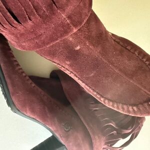 Lovely Burgundy suede heeled boots! Only worn a couple time. They are very comfortable and have a nice traction sole. I would keep them but they don’t fit my ankles.