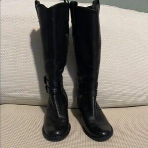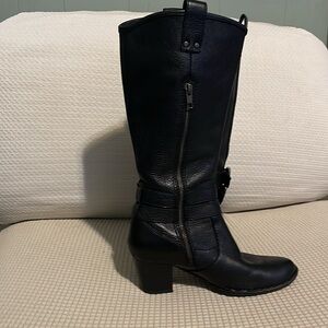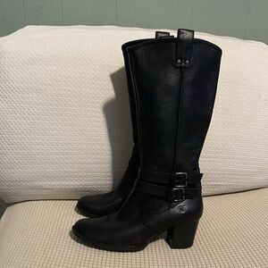 These Born black rain boots feature a classic tall silhouette with a glossy, waterproof finish. Designed for practicality, they offer a seamless construction and a rounded toe for comfort. Perfect for rainy days, these boots combine functionality with a sleek, timeless style.
