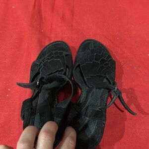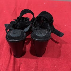 Chic black heels with stylish ruffle accents. Perfect for adding flair to any outfit. Comfortable and fashionable.