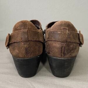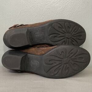 These Born "Zowy" distressed brown leather heeled low top harness ankle booties are in Excellent pre-owned condition. Labeled women's size 9.5. Heel measures 2" tall.