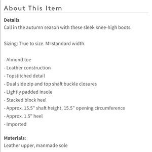 Call in the autumn season with these sleek knee-high boots. Sizing: True to size. M=standard width. - Almond toe - Leather construction - Topstitched detail - Dual side zip and top shaft buckle closures - Lightly padded insole - Stacked block heel - Approx. 15.5" shaft height, 15.5" opening circumference - Approx. 1.5" heel - Imported