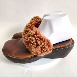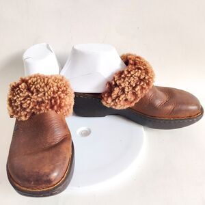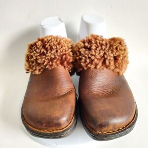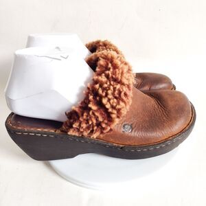 Born Brown Leather 2" Wedge Slip On Clogs Shearling Trim Womens Size 8 /39 Boho