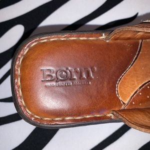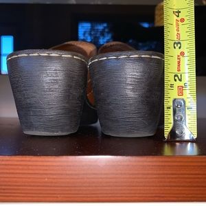 Brown clogs by Born. If you are looking for comfort, this pair will not disappoint. This a where ever, when ever pair! Perfect for quick errands but still maintains style. Soft leather upper and lining. Comes in size 7.