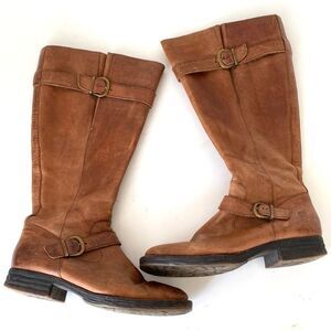 These Born heeled boots in a rich brown hue feature a classic equestrian-inspired design with decorative buckle straps and a rounded toe. Crafted from high-quality leather, they offer a timeless style that pairs well with various outfits, ensuring both fashion and function.