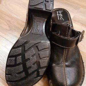 Brown upper with buckle going across the top. These were barely worn, in excellent condition. Size 9.