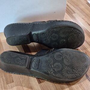 Rich dark brown leather slip on sandals. Step into comfort with Baltic Born's brown sandals, designed with wide textured leather straps and a contoured footbed for everyday ease. These slip-on sandals feature a durable sole and an open-toe design, perfect for casual outings.