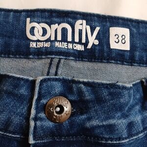 Keywords: Born Fly, Denim Shorts, Distressed, Paint Splatter, Raw Hem, Mens Shorts, Casual Shorts, Blue Shorts, Size 38, Streetwear, Urban Style