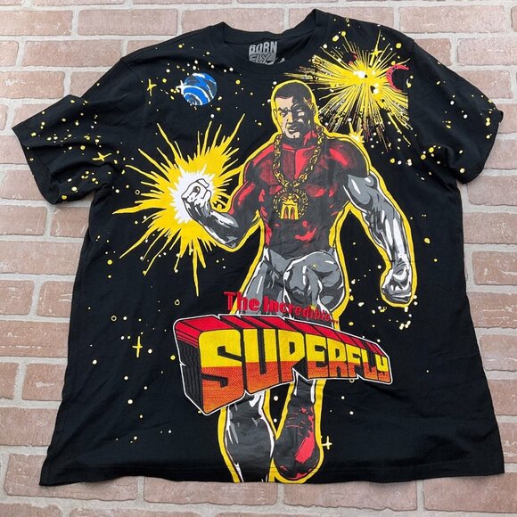 Born Fly T-Shirt for men in 3XLarge, featuring a black multi-color graphic print with "THE INCREDIBLE...SUPER FLY" embroidered. Made from premium cotton for ultimate comfort and style.
