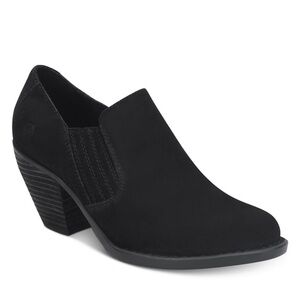 These black suede Fredrika booties from Born feature an understated silhouette in soft suede with a curved stacked block heel, slip on style with elastic gussets at the sides for easy on / off, an almond toe, rubber outsole, tucker board with steel shank, Opanka hand-crafted construction. F2503