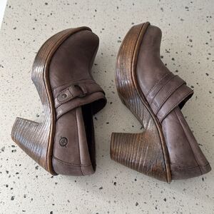 Born Haddon Taupe Leather Slip On Clogs Casual Shoes Block Heel Platform Size 6.5 EUC
