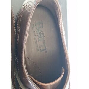 Classic Born Handcrafted Footwear oxford dress shoes featuring smooth brown leather uppers with traditional wingtip perforation detail and lace-up closure. Durable rubber sole with wood-grain stacked heel and signature Born logo stamp. Made for both style and comfort with quality leather lining and cushioned insoles.